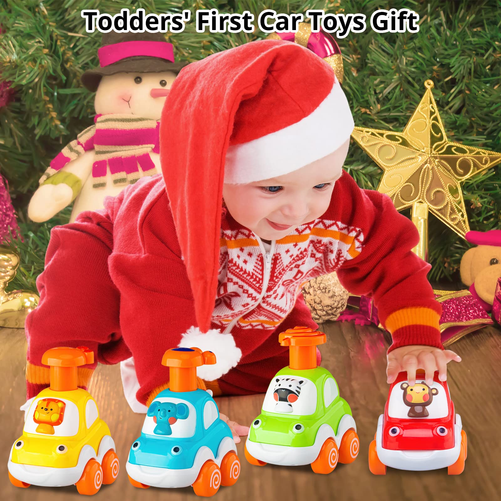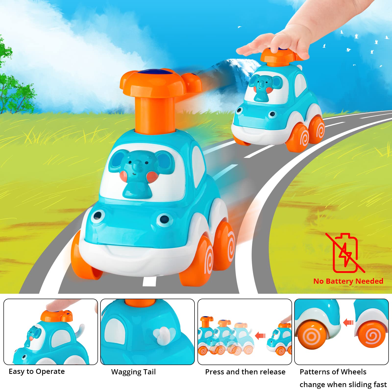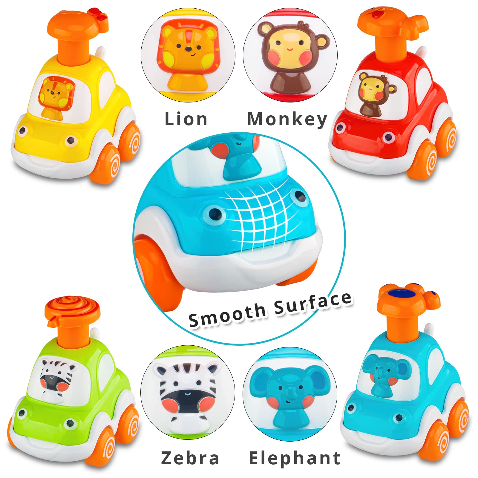 - 【Vibrant Colors, Cute Animals】: Colorful and cute, fun details with 4 animals’ drivers: monkey, lion, zebra, elephant. 4 different colors and animals. Perfect size for their chubby little fingers. The little tail wags while car goes.