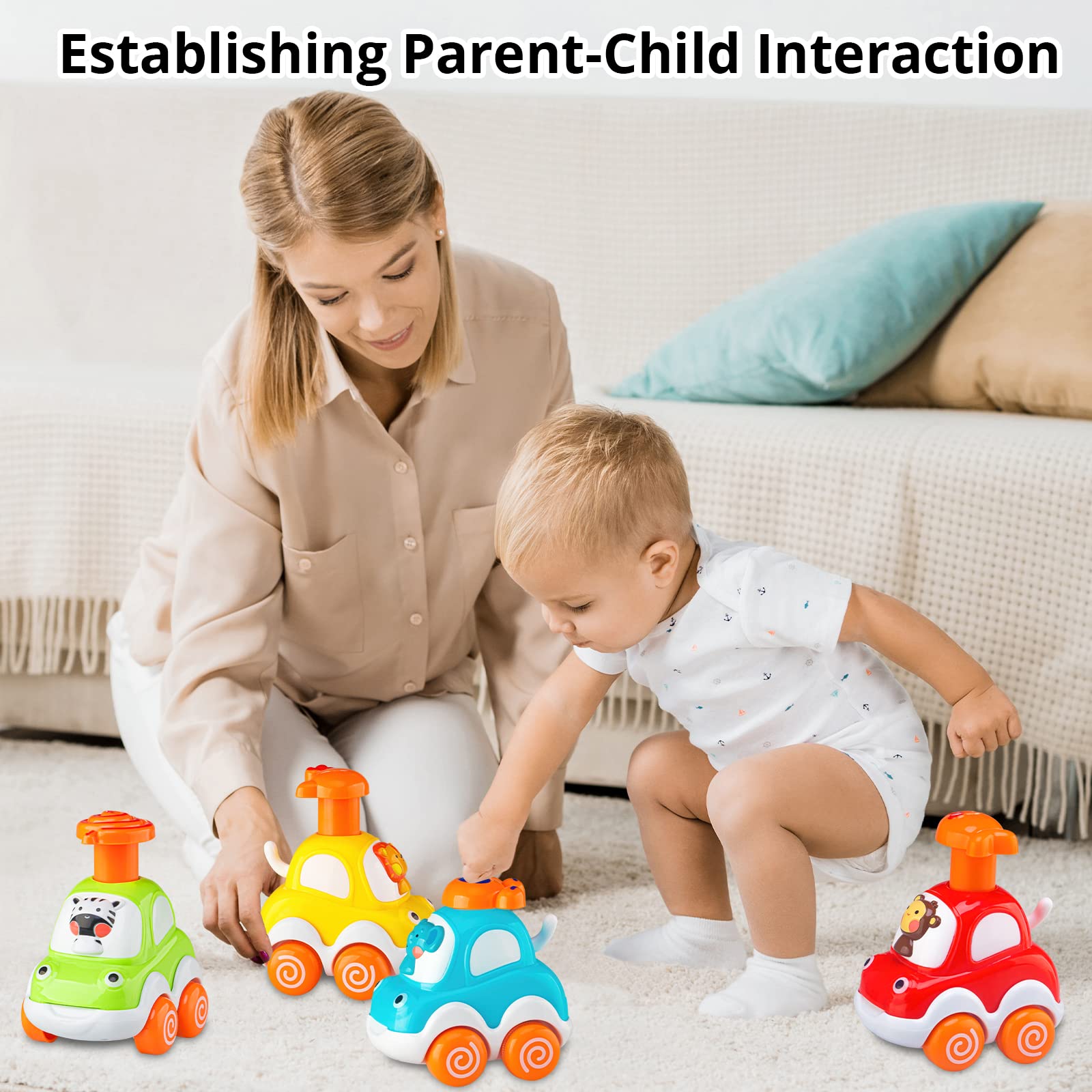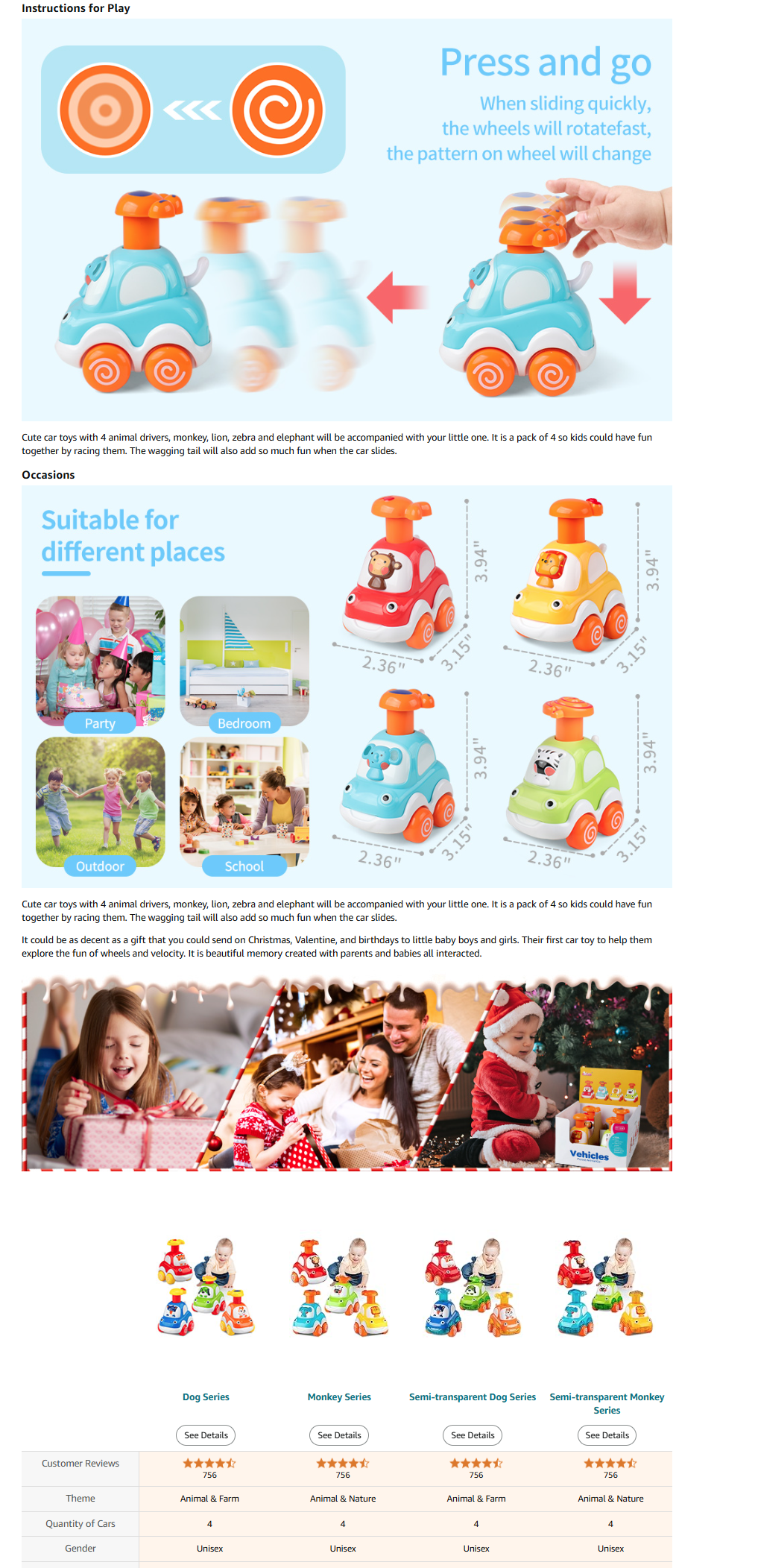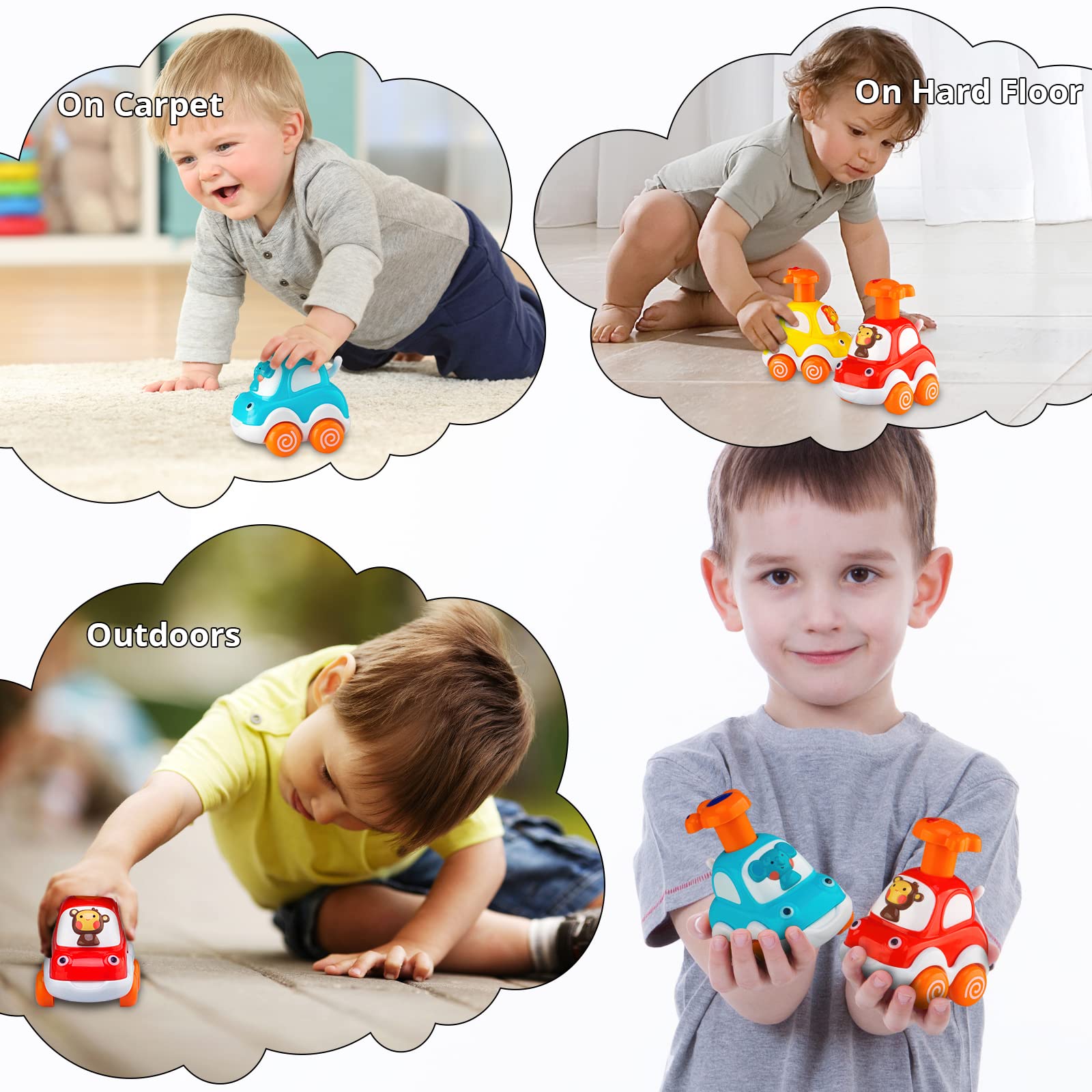- 【Vibrant Colors, Cute Animals】: Colorful and cute, fun details with 4 animals’ drivers: monkey, lion, zebra, elephant. 4 different colors and animals. Perfect size for their chubby little fingers. The little tail wags while car goes.