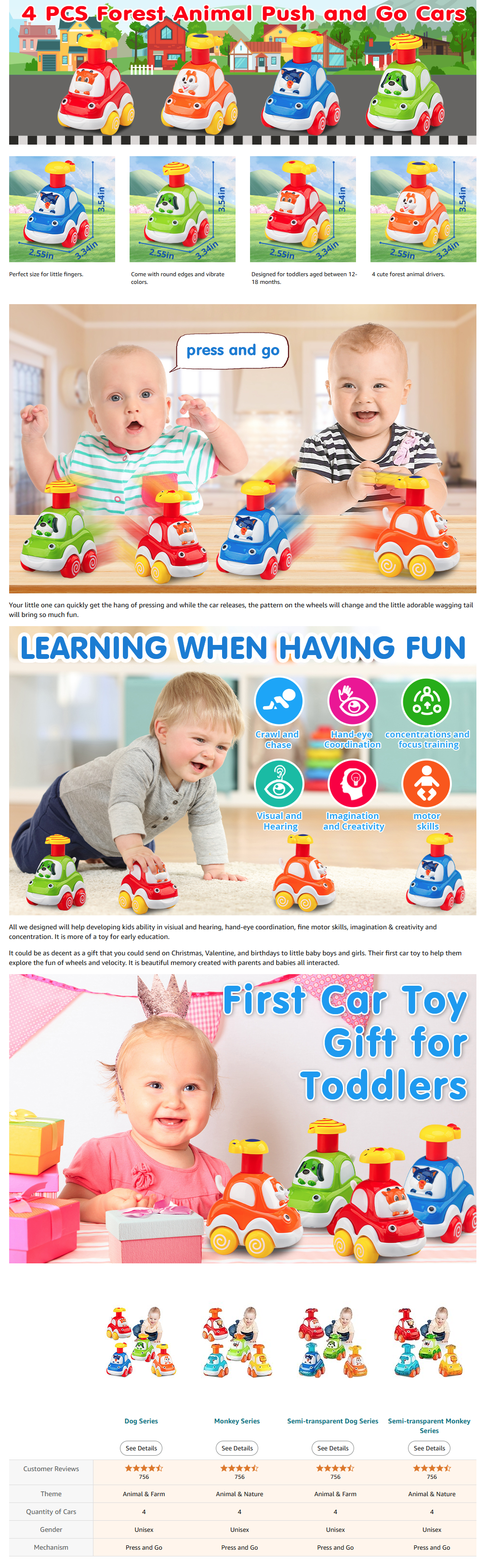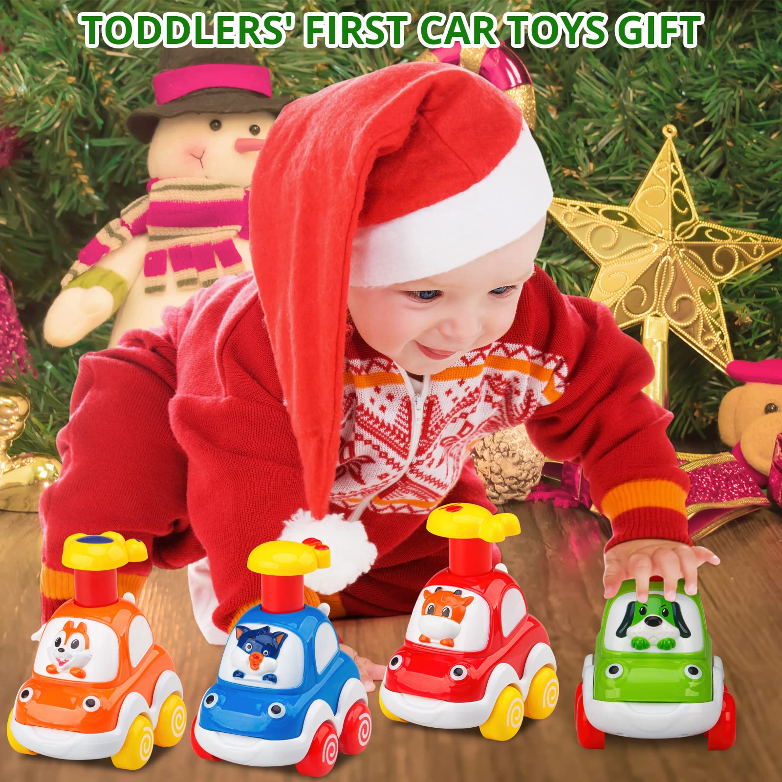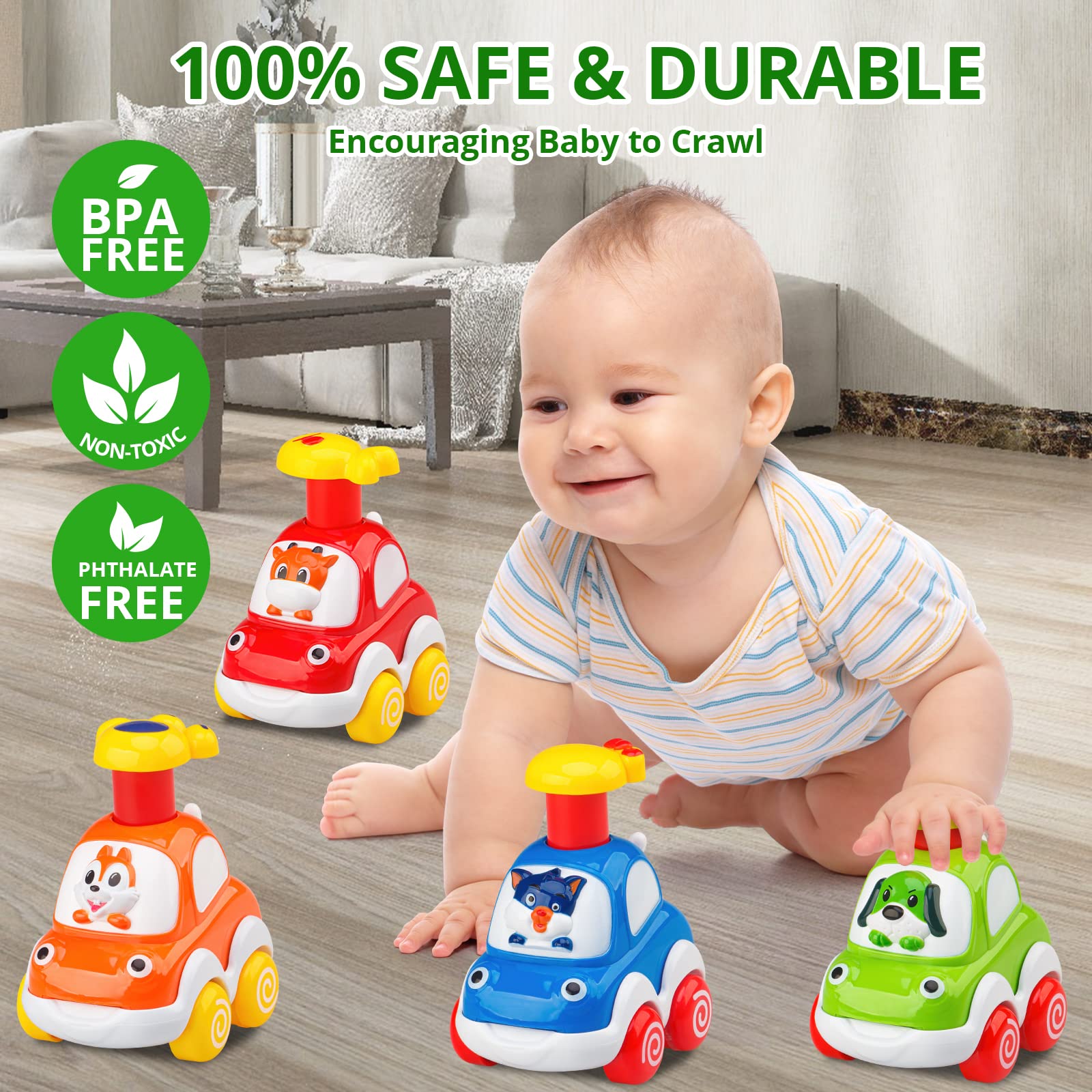 • 【Vibrant Colors, Cute Animals】: Colorful and cute, fun details with 4 animals’ drivers: calf, dog, squirrel, cat. 4 different colors and animals. Perfect size for their chibby little fingers. The little tail wags while car goes.