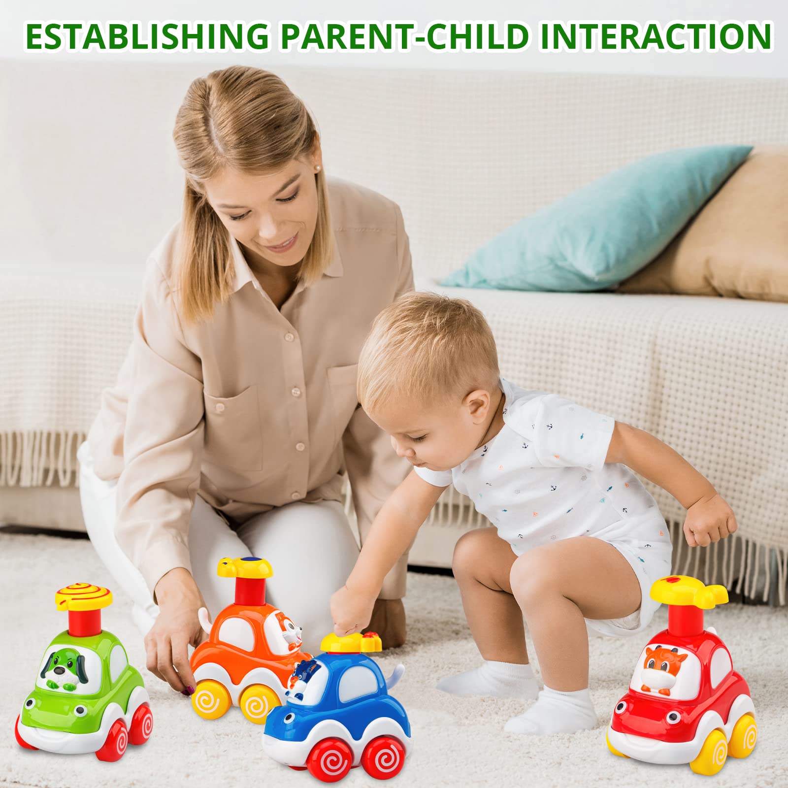 • 【Intuitive and Educational】: Kids could easily press the top and see the car goes, greatly improve kid’s ability of viewing, hearing and motor skills. Excellent toy for early education.
