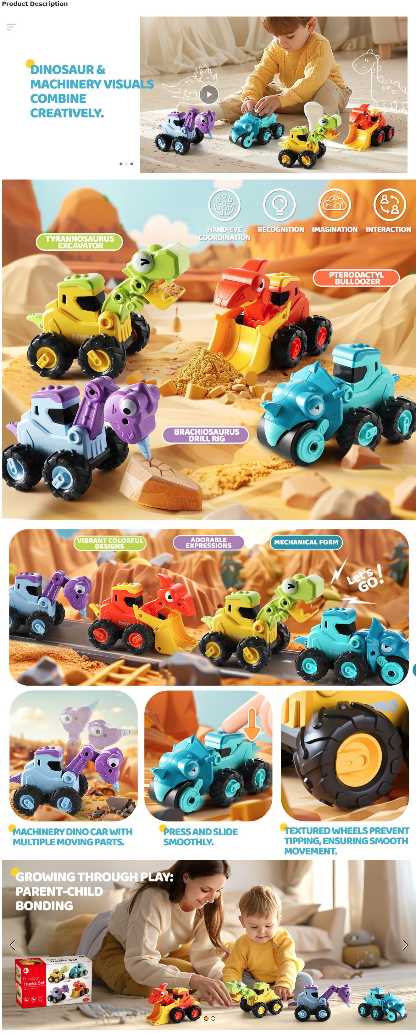 • 【Cute Dinosuar Figures】4 monster trucks including a Triceratops Steamroller, a Pterodactyl Bulldozer, Brachiosaurus Drill Rig and a Tyrannosaurus Excavator.
