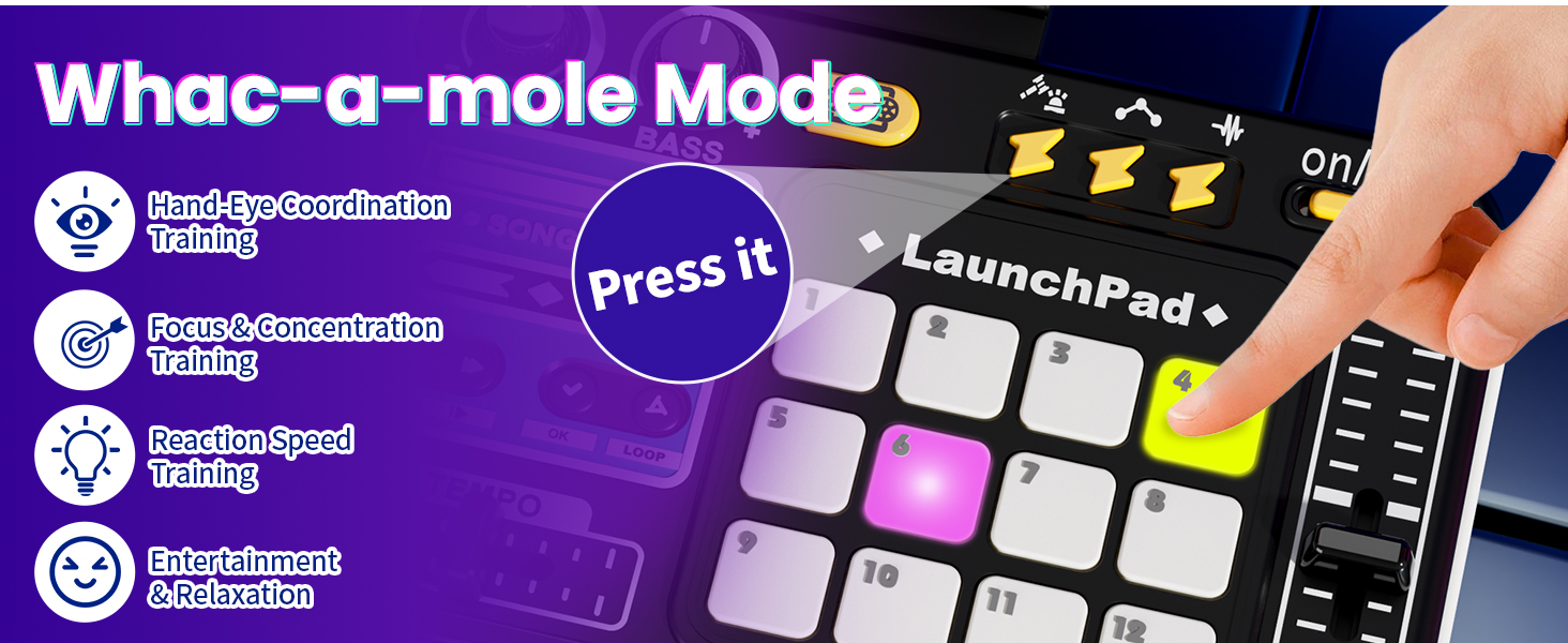 - 【Lights, Rhythm & Interactive Game Mode】Music meets action in game mode! This interactive baby DJ table lets kids manually adjust light effects and enjoy a built-in Whack-a-Mole rhythm game. A fun and educational DJ music toy that helps build timing, coordination, and performance confidence