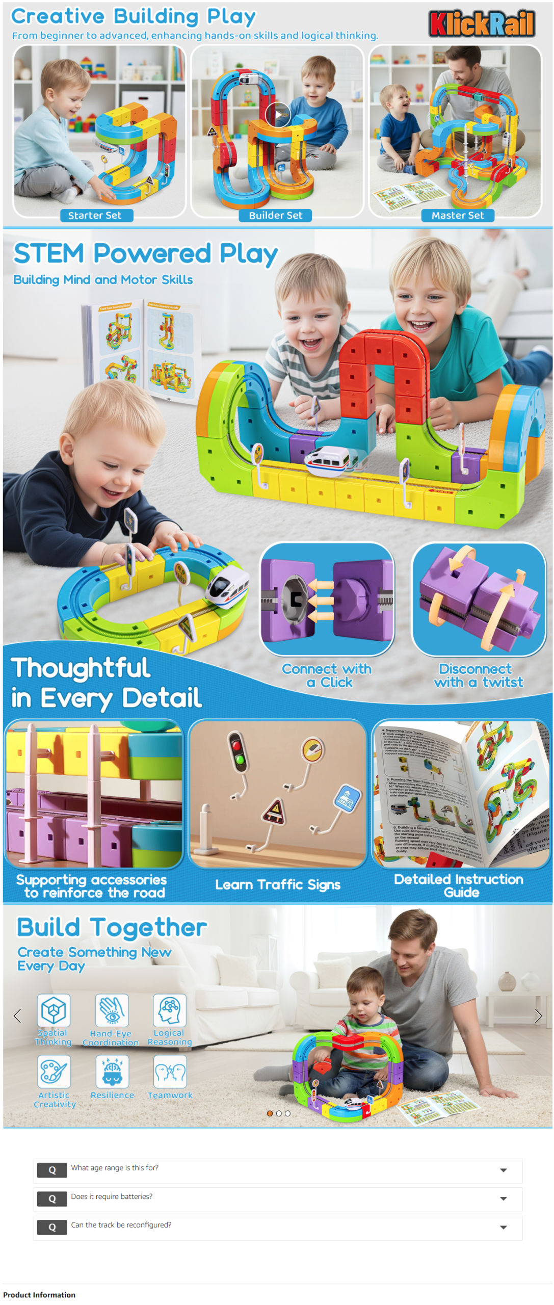 • STEM Learning Benefits: It develops spatial reasoning, problem-solving skills and creativity as children design and build their own unique track setups